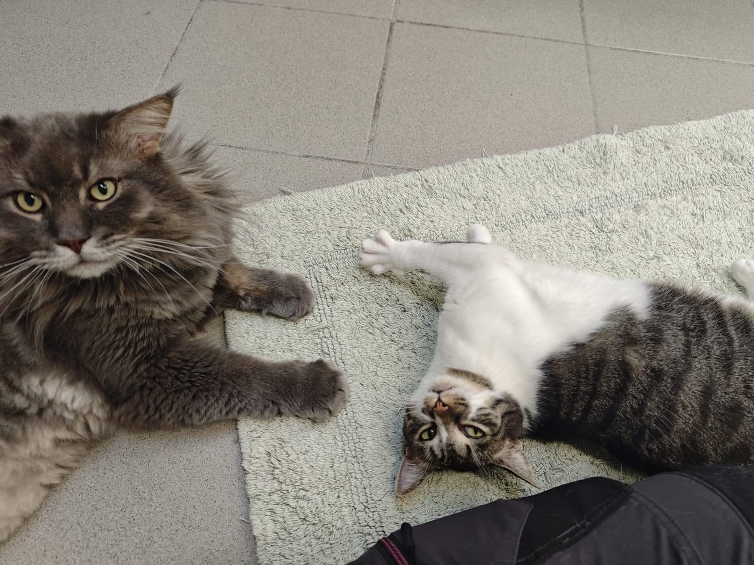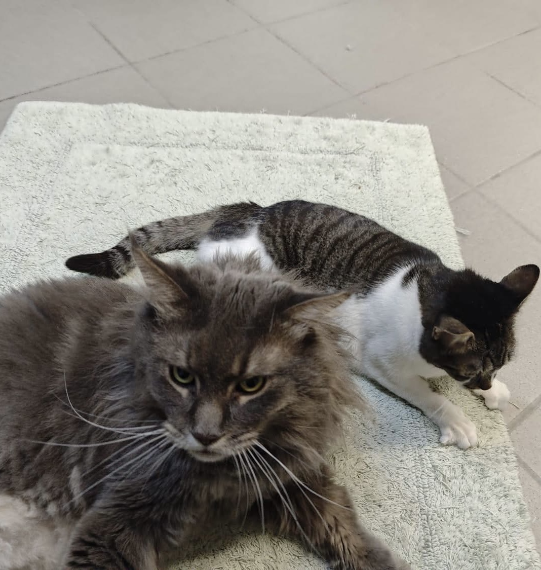 Karine lebt seit fast zwei Jahren bei uns im Tierheim. Sie war unter den Katzen immer das Mobbingopfer und vor uns Menschen zog sie sich auch lieber zurück. Um der kleinen Katzendame endlich etwas Ruhe zu gönnen, - sie hatte mittlerweile wirklich Angst vor ihren Zimmerkollegen - packten wir sie kurzerhand zu Ares ins Zimmer, der im Juli 2025 wegen Umzug bei uns abgegeben wurde. Der große „Buddha“, durch fast nichts aus der Ruhe zu bringen, ließ die kleine Katzendame erstmal in Ruhe ankommen und Karine fühlte sich von Tag zu Tag sicherer bei ihrem großen neuen Mitbewohner. Inzwischen sind die beiden nicht mehr zu trennen und Karine ist sogar gegenüber Pflegern und Ehrenamtlichen deutlich aufgeschlossener geworden. Wir suchen für das ungleiche Paar ein ruhiges Zuhause in reiner Wohnungshaltung, in dem sie auf jeden Fall zusammenbleiben dürfen. Ein abgesicherter Balkon, auf dem die beiden auch mal die frische Luft und Sonne genießen können, würde ihr Glück abrunden. Andere Haustiere und Kinder sollten nicht im neuen Heim leben, weil Karine sehr stressanfällig ist und der Trubel für die Kätzin einfach zu viel wäre.