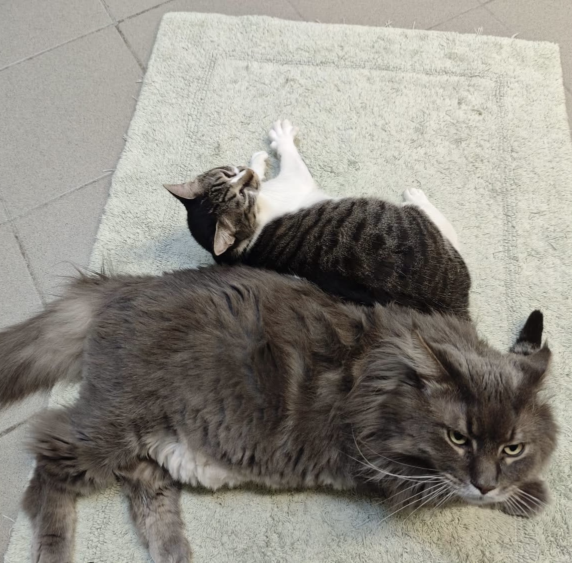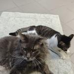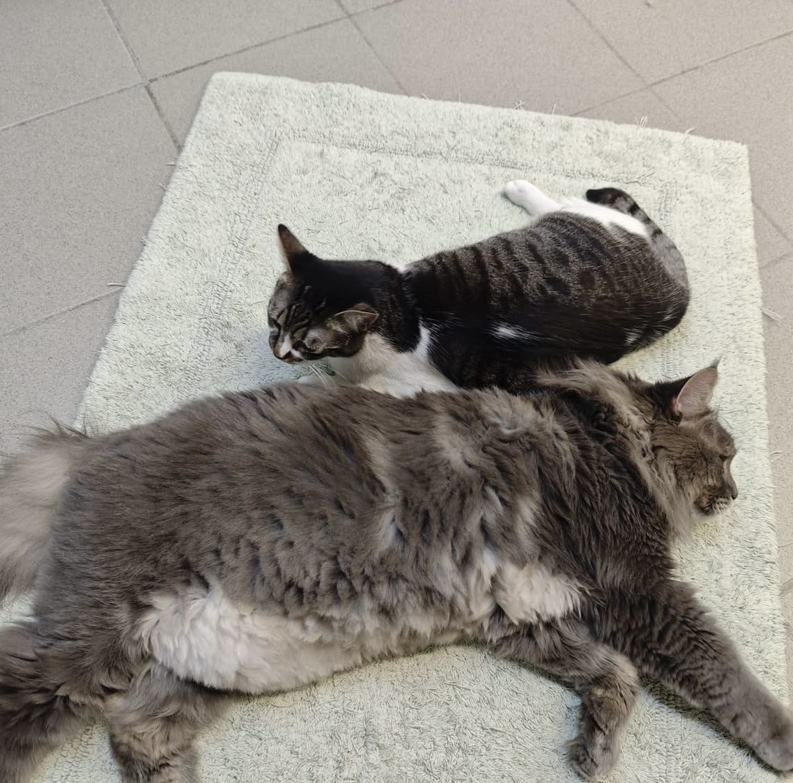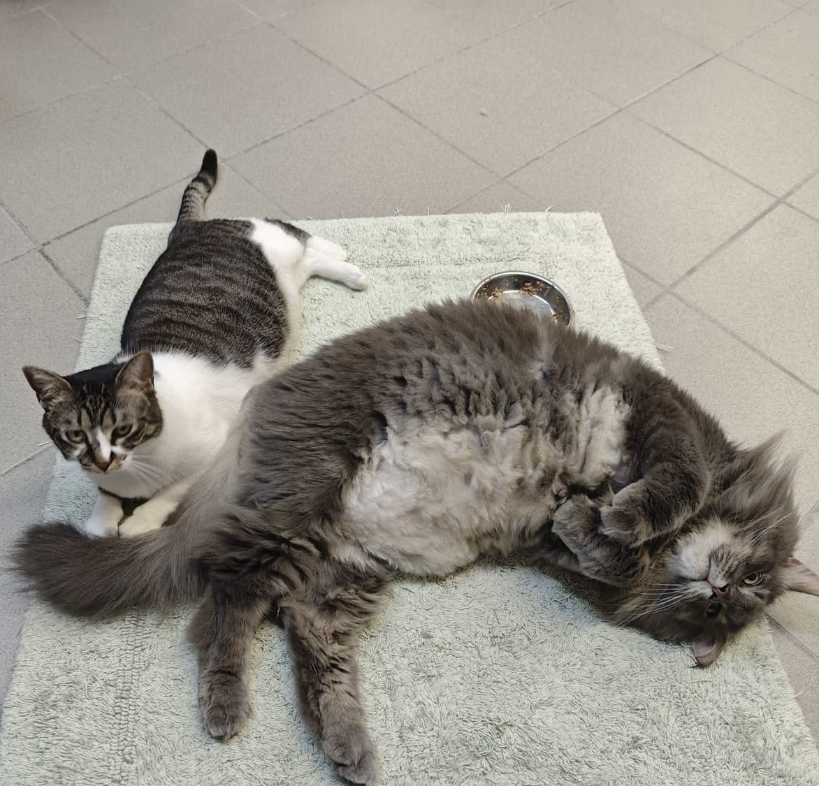 Karine lebt seit fast zwei Jahren bei uns im Tierheim. Sie war unter den Katzen immer das Mobbingopfer und vor uns Menschen zog sie sich auch lieber zurück. Um der kleinen Katzendame endlich etwas Ruhe zu gönnen, - sie hatte mittlerweile wirklich Angst vor ihren Zimmerkollegen - packten wir sie kurzerhand zu Ares ins Zimmer, der im Juli 2025 wegen Umzug bei uns abgegeben wurde. Der große „Buddha“, durch fast nichts aus der Ruhe zu bringen, ließ die kleine Katzendame erstmal in Ruhe ankommen und Karine fühlte sich von Tag zu Tag sicherer bei ihrem großen neuen Mitbewohner. Inzwischen sind die beiden nicht mehr zu trennen und Karine ist sogar gegenüber Pflegern und Ehrenamtlichen deutlich aufgeschlossener geworden. Wir suchen für das ungleiche Paar ein ruhiges Zuhause in reiner Wohnungshaltung, in dem sie auf jeden Fall zusammenbleiben dürfen. Ein abgesicherter Balkon, auf dem die beiden auch mal die frische Luft und Sonne genießen können, würde ihr Glück abrunden. Andere Haustiere und Kinder sollten nicht im neuen Heim leben, weil Karine sehr stressanfällig ist und der Trubel für die Kätzin einfach zu viel wäre.